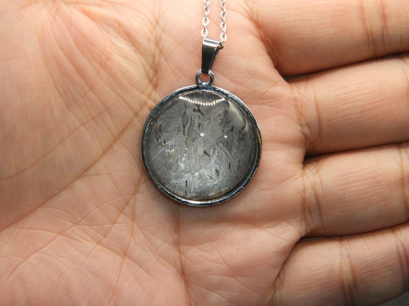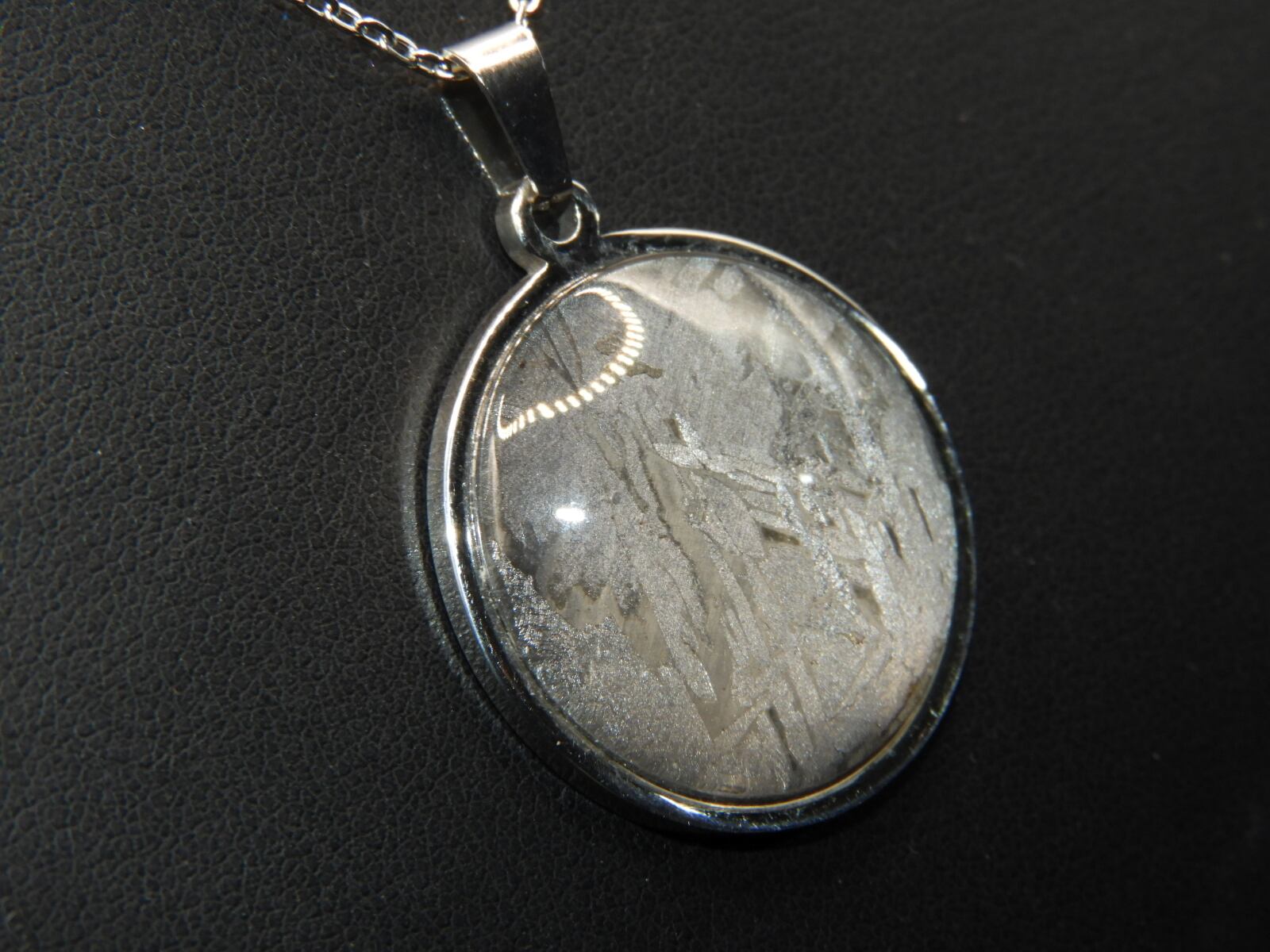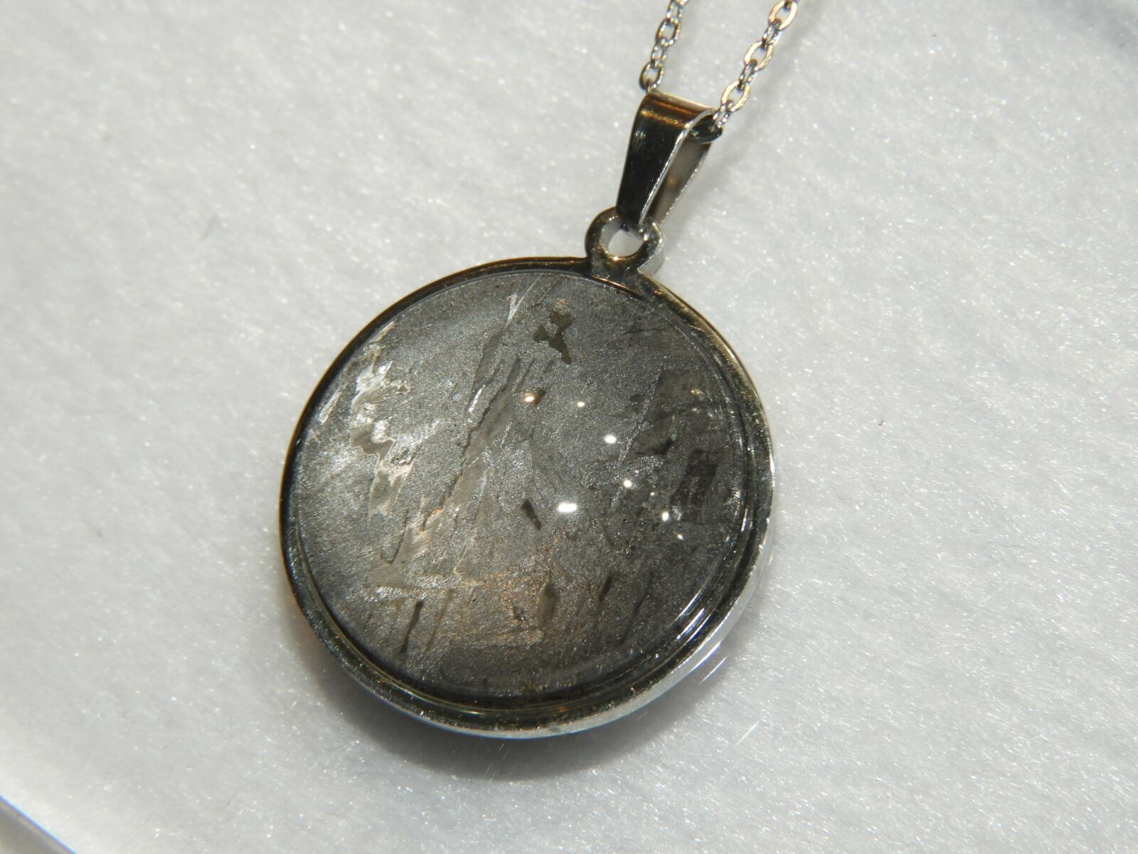 宇宙よりの使者!パラサイト隕石のセイムチン隕石の原石をつかってペンダントにしました!そして、他店にない強みとして隕石を当店でエッチング作業をした後、枠に入れ樹脂でコーティングをしてアクセサリーにしました!