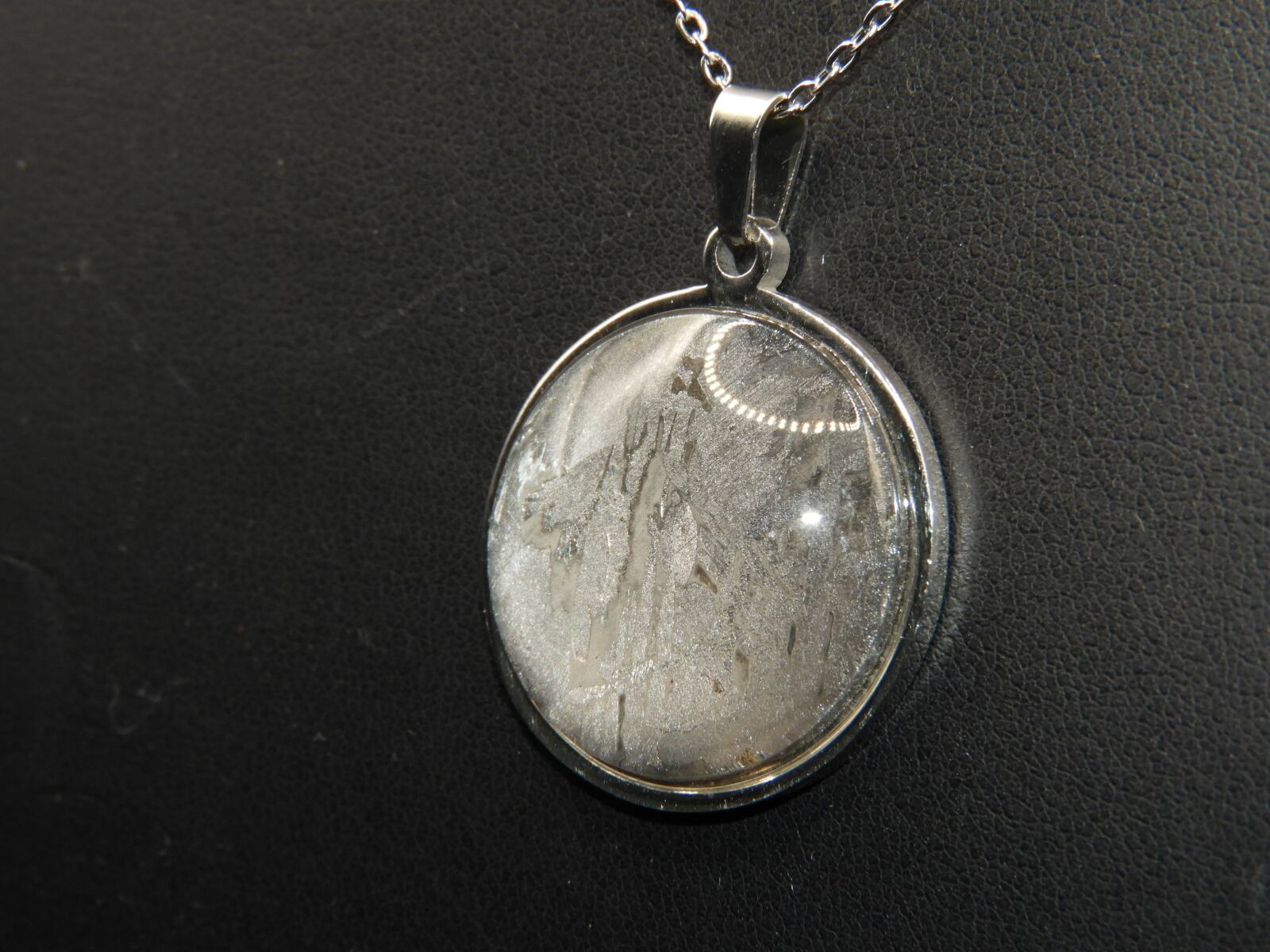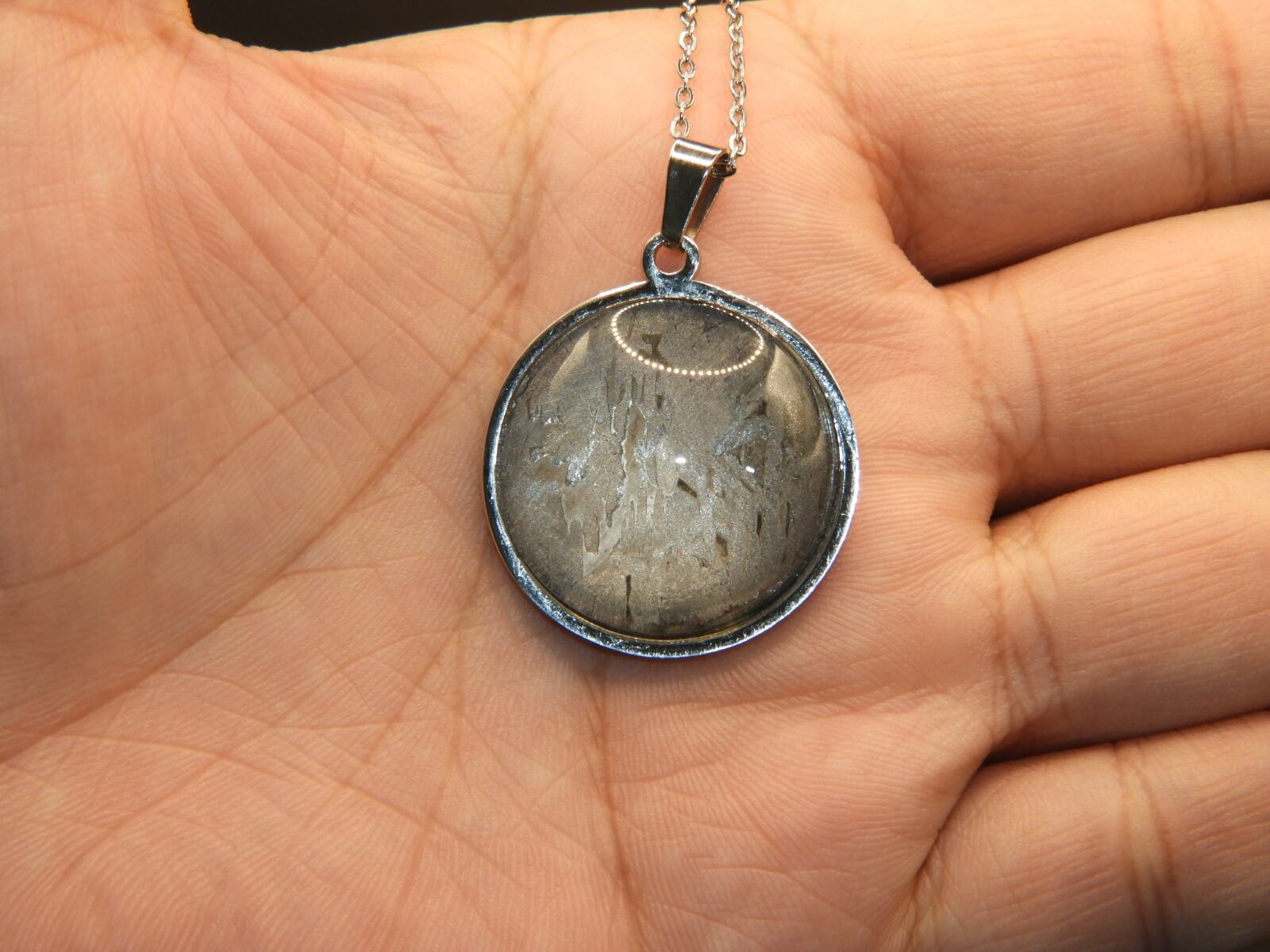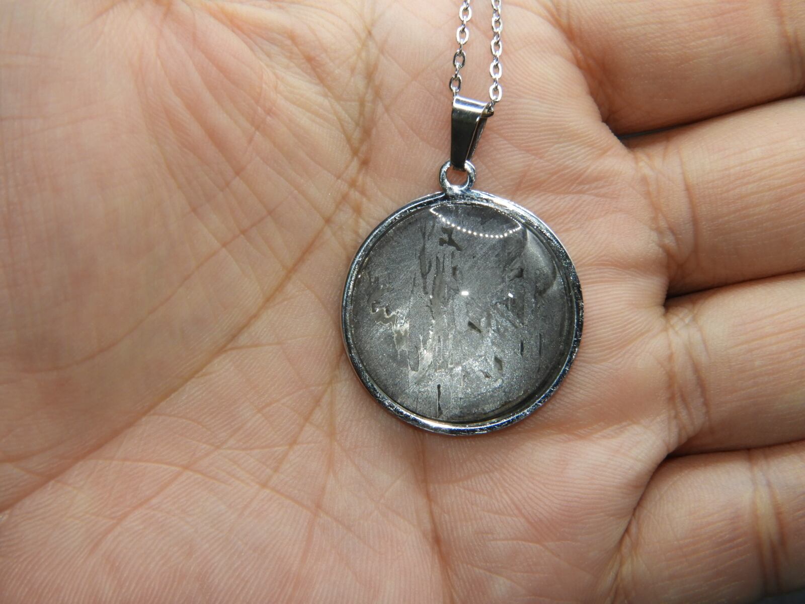 宇宙よりの使者!パラサイト隕石のセイムチン隕石の原石をつかってペンダントにしました!そして、他店にない強みとして隕石を当店でエッチング作業をした後、枠に入れ樹脂でコーティングをしてアクセサリーにしました!